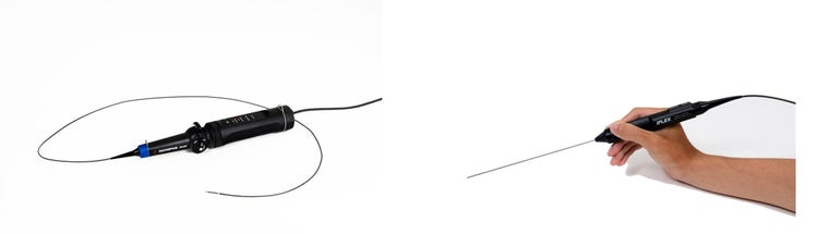 左)フレキシブルスコープ(軟性鏡)は新たに開発した湾曲機構を搭載し、安定性と耐久性を持たせた。
