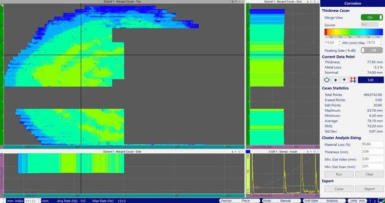 - 厚みCスキャンおよび統計値、パレットエディタ、Aスキャン再同期、クラスター解析測定が含まれる腐食マネージャーを使用してデータ表示を最適化します