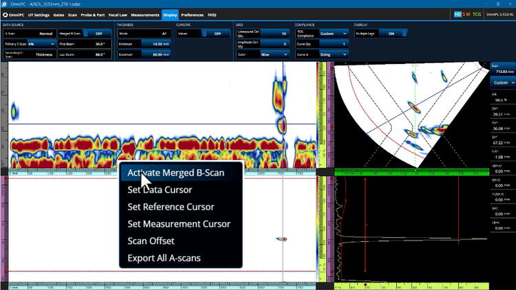 データマージ機能、ゲートとカーソル、最大振幅/最小厚みなど、WeldSightソフトウェアの高度なツールを活用すると、OmniScan X4で収集したTFMとPCIのデータを全方位から徹底的に調査できます。