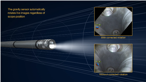- 検査状況を、より分かりやすく:スコープ先端に搭載された重力センサーで、ライブ映像の天地方向を実際の天地方向に合わせて表示(画像自動回転機能)。スコープを挿入した長さを表示する機能も装備し、見失いがちな検査箇所の位置をすばやく認識できます。