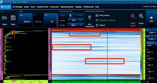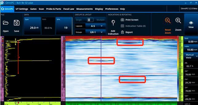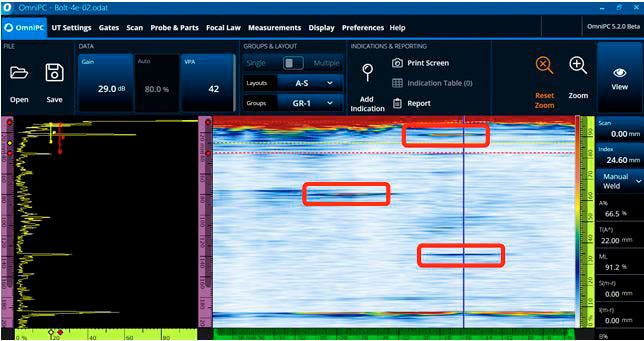 선형 배열 프로브와 원뿔형 스캐닝 기법을 사용해 볼트의 모든 결함을 감지했습니다. 그러나 이 과정은 추가적인 단계가 필요했습니다. 볼트 머리 상단 표면에서 20mm 떨어진 위치의 결함을 감지하려면 빔의 입사각을 높이기 위해 웨지를 사용해야 했습니다. 또한, 이 결함 신호와 볼트 머리의 바닥 표면 가장자리의 신호가 너무 가까워서 구분하기 어려웠습니다(그림 12).