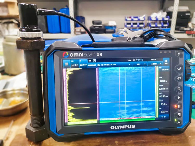 그림 1. 볼트에 위치한 링 배열 프로브에 연결된 OmniScan X3 결함 탐상기