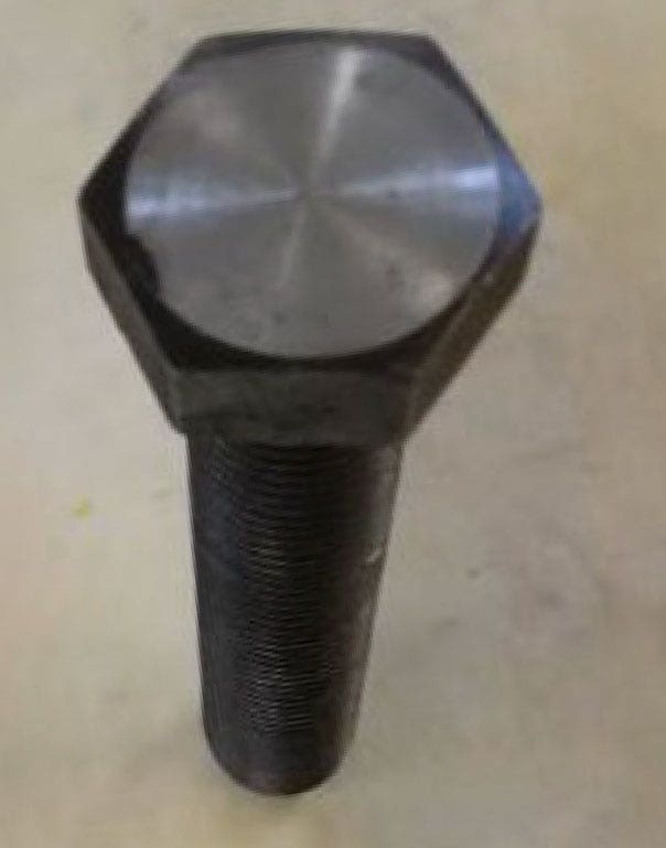 그림 3. 기계적 결함이 있는 볼트 시험 블록. 이 시험 블록은 제조 결함, 즉 볼트 머리의 상단 표면에서 20mm(볼트 머리가 나사와 만나는 지점), 80mm, 140mm 떨어진 지점에 1mm 깊이의 홈이 위치한 결함을 가진 볼트입니다.