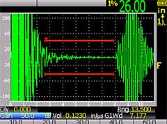 In the example below representing a setup with an Epoch XT and an A601S-SB transducer, the left screen image represents a typical echo pattern from an undamaged filter. The echoes at the left side of that waveform represent reverberations of the outgoing sound pulse, and the echoes at the right side represent the reflection from the far end. There should be no significant echoes in the zone in the middle that is marked by the red gate. The right screen image represents an echo pattern from a filter with two cracks parallel to the end, one approximately one-quarter of the way through and one halfway through. The large peak at the right side of that waveform has disappeared because sound energy is no longer reflecting from the far wall, and two new peaks corresponding to the cracks have appeared. The transducer can then be moved to as many points as desired on the face of the filter to check for cracks at other locations.