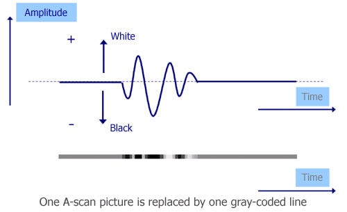 These signals are then processed by phase/amplitude (+/-) and time of flight (us) and displayed using a grey scale palette.