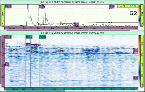 The Shear Wave transducers are common mono-crystal (composite) ultrasonics transducers fitted into 45, 60, 0r 70 degree wedges. In order to facilitate analysis of the often large scan area, B-scan (side view) imaging is employed, colors are based on amplitude.