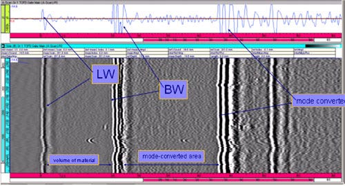 Details of wide beam subcomponents and data display- lateral wave (sub near surface), backwall, and volume of the material. (image)