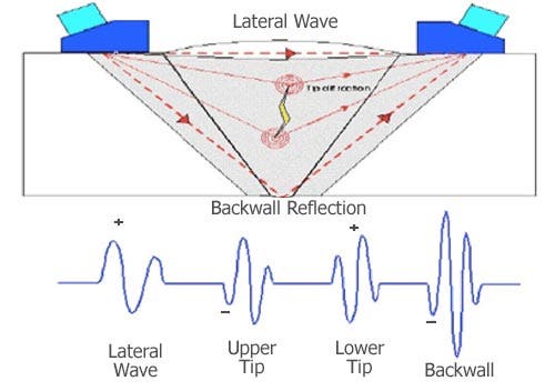 Tofd utilizes highly dampened transducers set into refracted longitudinal wave wedges to produce a very wide beam L-wave to cover the area of interest. Unlike Pulse-Echo it utilizes a pair of transducers in pitch-catch configuration (1 send, 1 receive probe). Detection of defects is based on Huygens's principal- basically when an object is hit with a wave of energy the object will vibrate, thus emitting diffracted energy in all directions as well as reflected energy. These Omni-directional diffracted waves will be picked up by the receive probe.