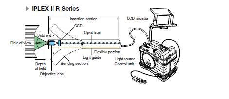 비디오스코프는 대물 렌즈를 통해 피사체에서 반사된 빛을 통해 CCD의 표면으로 보냅니다. 그런 다음 CCD는 빛을 전기 신호로 변환하고 이 데이터를 산업내시경 제어 장치로 전송합니다. 다음 장치는 비디오 출력을 모니터로 보냅니다.