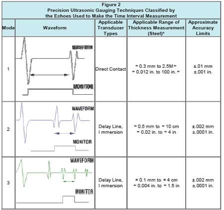 Accuracy: Many factors affect measurement accuracy in a given application, including proper instrument calibration, uniformity of material sound velocity, sound attenuation and scattering, surface roughness, curvature, poor sound coupling, and backwall non-parallelism. All of these factors should be considered when selected a gauge and transducer. With proper calibration, measurements can usually be made to an accuracy of +/- 0.001" or 0.01 mm, and in some cases accuracy can approach 0.0001" or 0.001 mm. Accuracy in a given application can best be determined through the use of reference standards of precisely known thickness. In general, gauges using delay line or immersion transducers for Mode 3 measurements are able to determine the thickness of a part most precisely.