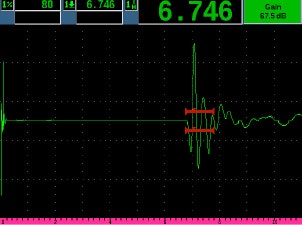 그림 1은 강철 플라이 코드의 에코입니다. 접지면이 약 12.5mm(0.5인치)인 자동차 타이어의 외부 접지면에서 측정한 것입니다. 여기에서는 39DL PLUS 측정기와 M1036 트랜스듀서탐촉자(2.25MHz)로 측정합니다. 이 경우, 첫 번째 포지티브 로브에서 에코가 측정됩니다.