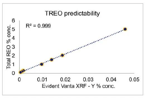 총 17개 REE의 완전한 분석은 불가능하거나(pXRF의 경우), 엄청나게 느리고 비용이 많이 들기(ICP의 경우) 때문에, 현장에서 실시간으로 전체 희토류 농도를 측정하는 방법을 찾는 것이 유용합니다. 비소, 구리, 납 및 아연과 같은 일부 원소를 금 검출 탐지기로 사용할 수 있는 방법과 유사하게, 대상 REE 광물에 자체 성분으로 검출 가능한 수준의 이트륨(Y)이 있다면 희토류 산화물(REO)로 유사한 목표를 달성하기 위해 이트륨을 사용할 수 있습니다.
