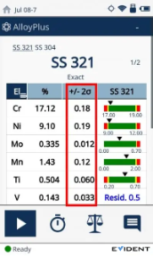 스테인리스강 321에 대한 이 테스트 결과에서 Vanta XRF 분석기는 2시그마를 사용하여 결과를 계산합니다.