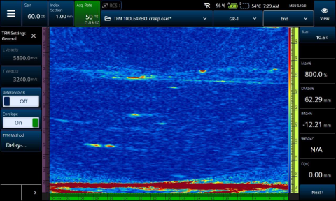 예를 들면, 기존의 TFM을 사용하여 크리프 손상을 촬영한 이 이미지와 PCI 모드의 이미지를 비교해 보세요.