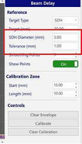 아래 Beam Delay(빔 지연) 양식에서 볼 수 있듯이 허용 오차는 1mm로 적절하게 유지되고 SDH의 직경(3mm)도 입력됩니다. 이 소프트웨어는 이 값을 사용하여 SDH의 중심과 실제 빔의 TOF가 반경을 교차하는 위치 사이에서 오프셋을 계산합니다. 허용 오차 영역(하단 데이터 디스플레이의 녹색 영역)은 오프셋을 반영하여 SDH의 크기를 포함하지만 1mm 허용 오차를 초과하지 않습니다. 이 방법을 사용하면 빔 지연 계산을 위한 TOF 정밀도가 일반적인 SDH 보정 방법을 사용할 때보다 높아집니다.