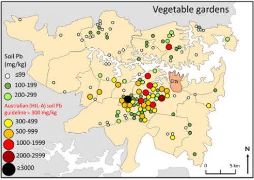 In addition to 40% of Sydney gardens containing soil above the 300 mg/kg Australian health guideline, approximately one in seven homes also had soil lead levels greater than 1,000 mg/kg. Soil metal concentrations were typically greatest around garden drip lines.