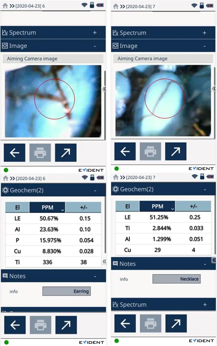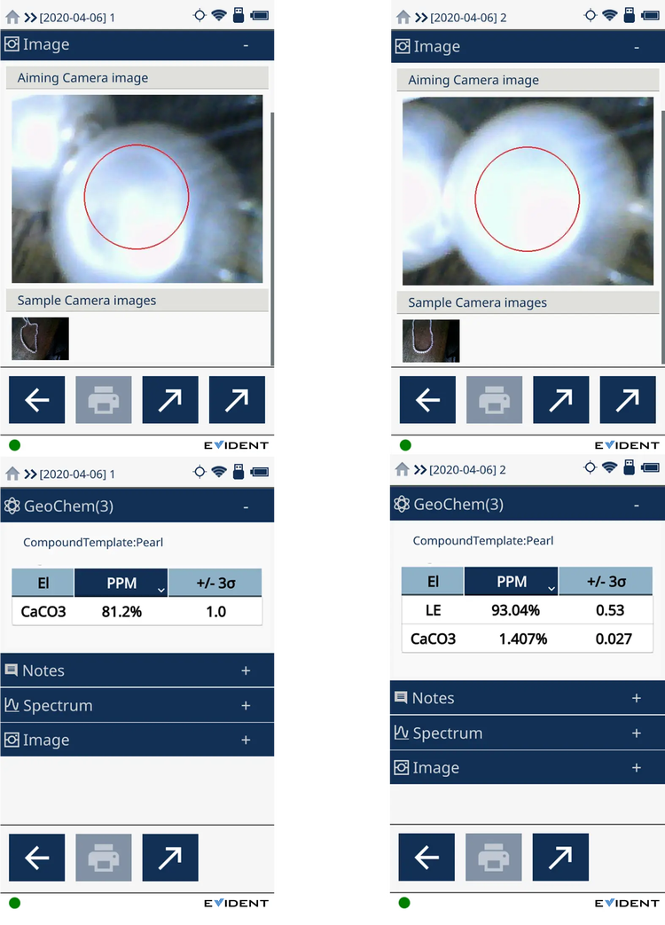 이 분석기는 짧은 테스트 시간(20초) 동안 두 원석에서 탄산칼슘 비율(CaCO3)을 계산했습니다. 그 결과, 진짜 진주와 모조품을 신속하게 식별할 수 있었습니다. 다음 샘플 및 결과를 확인하십시오.