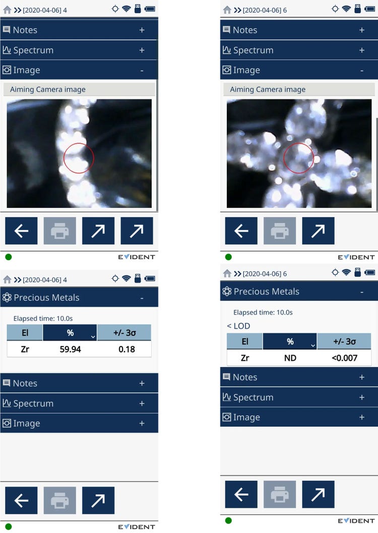 XRF의 작동 방법을 보여주기 위해 Vanta 장비로 진짜 다이아몬드 및 큐빅 지르코늄(CZ) 조각을 테스트한 다음, 그 결과를 정량적으로 분석했습니다. 이 테스트에는 5초가 걸렸습니다. 그 결과, 다이아몬드와 CZ 조각을 빠르게 식별할 수 있었습니다.
