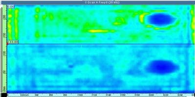 One advantage of the OmniScan MX ECA flaw detector is that it uses 8 frequencies simultaneously, greatly increasing the probability of detection and sizing performance. Every frequency recorded can be analyzed using the amplitude or phase setting, giving the inspector up to 16 C-scans to analyze. The C-scans are in color and help inspectors visualize the discontinuities.