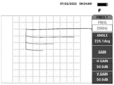 또 다른 일반적인 검사에는 금속에 도장된 페인트 같은 비전도성 코팅의 측정이 포함됩니다.아래 화면 디스플레이에서는 알루미늄의 비금속 코팅을 보여줍니다.이 응용 분야의 경우, 프로브는 공기 중에서 “nulled”(균형 조정)된 후 샘플 위에 놓입니다.상단 선은 코팅이 전혀 없는 알루미늄의 신호를 보여줍니다.두 번째 선은 0.004인치 코팅, 그 다음은 0.008인치 코팅, 그리고 하단 선은 0.012인치 코팅입니다.이 이미지를 만들기 위해, 각 신호 사이의 분리를 표시하려고 각 측정 사이에 표시 위치를 변경해야 했습니다.이 보정이 완료된 후, 검사자는 재료를 측정하고 신호가 화면을 가로질러 이동하는 거리를 관찰합니다.코팅이 너무 두껍거나 너무 얇으면 경보 기능을 사용하여 검사자에게 알릴 수 있습니다.