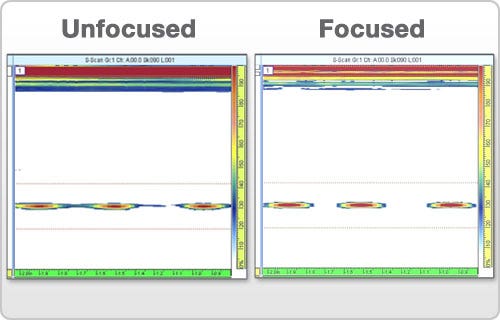 Like aperture and the number of focal laws, electronic beam focusing (as discussed in Section 2.14) can have a significant effect on both the sharpness of an image and the amplitude of the reflection from a target. The scans below show unfocused (left) and focused (right) 5 MHz images of three side drilled holes in a steel reference block.