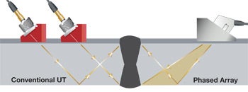 기존의 UT와 비교하여 위상 배열 기술의 장점은 단일 탐촉자 조립품으로 여러 소자를 사용해 빔을 조정, 집중 및 스캐닝할 수 있다는 것입니다. 일반적으로 부채꼴 스캐닝이라고 하는 빔 스티어링은 구성 요소에 대한 적절한 각도의 매핑에 사용할 수 있습니다. 이 경우 형상이 복잡한 구성 요소의 검사를 크게 간소화할 수 있습니다. 또한 탐촉자의 작은 설치 공간과 프로브를 움직이지 않고 빔을 스위핑할 수 있는 기능은 기계 스캐닝을 위한 접근이 제한된 경우 이러한 구성 요소를 검사하는 데 도움이 됩니다. 부채꼴 스캐닝은 일반적으로 용접 검사에도 사용됩니다. 단일 프로브에서 다중 각도로 용접을 검사할 수 있는 기능 덕분에 이상 징후의 탐상 확률이 크게 증가됩니다. 전자 초점 기능을 통해 예상되는 결함 위치에서 빔 모양과 크기를 최적화할 뿐만 아니라 탐상 확률을 더 최적화할 수 있습니다. 다중 깊이로 초점을 맞추는 기능에 의해 체적 검사에 대한 심각한 결함의 크기를 조정하는 기능도 개선됩니다. 초점 기능은 까다로운 응용 분야에서 신호 대 잡음비를 크게 개선할 수 있고, 많은 소자 그룹에서 전자 스캐닝을 사용해 매우 빠르게 C 스캔 이미지를 생성할 수 있습니다.
