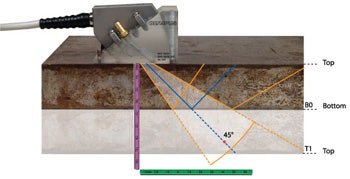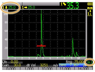 Conventional flaw detectors normally use the single beam index point of the wedge as the reference from which depths and distances are calculated. In this example, the top line of the first display indicates that the bottom reflector is 25 mm in front of the beam index point at a depth of 25 mm, and that the measured sound path from the beam index point to the reflector is 35.35 mm. The second display indicates that the top reflector is 50 mm in front of the beam index point at the surface (depth zero), and that the measured sound path from the beam index point to the reflector is 70.71 mm. The first leg versus second leg differentiation is indicated by the readouts 1L1 and 1L2 (short for Gate 1 Leg 1 and Gate 1 Leg 2 respectively) on the lower right edge of the screen.