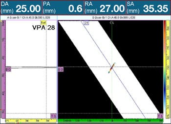 Phased array instruments, like quality conventional ultrasonic flaw detectors, offer software tools for identifying the position of defects and other reflectors. Typically these locate a reflector in terms of its horizontal position with respect to the probe, its depth with respect to the material surface, and the sound path distance between the beam index point and the reflector. Additionally, when skip paths are employed the instrument should identify the skip leg in which the reflector occurs.