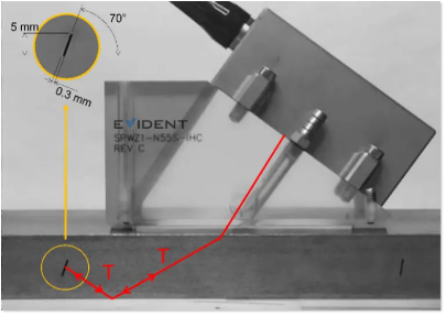 PCI의 이 같은 특징을 강조하기 위해, 이 두 번째 사례에서는 SPWZ1-N55S-IHC 웨지와 7.5L60-PWZ1 위상 배열 프로브를 사용한 70° 방향 비표면파괴 노치를 포함하는 강철 블록의 검사 결과를 제시합니다.그림 7은 시험 구성을 제시합니다.