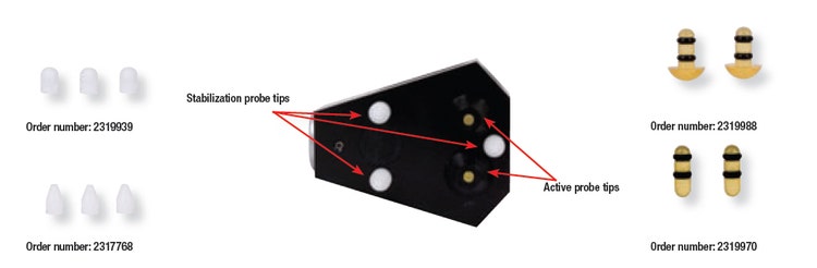 프로브는 2개의 고정 또는 용수철 장착 활성 프로브 팁과 3개의 흰색 플라스틱 안정화 팁으로 구성되어 있습니다. 잦은 사용이나 부적절한 사용은 팁의 상태 악화를 유발합니다. 아래 단계에 따라 팁을 새 팁으로 쉽고 빠르게 교체할 수 있습니다.