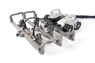 SteerROVER 스캐너 및 프로브 홀더 랙은 세로 방향 용접부를 검사하기 위해 구부릴 수 있습니다.