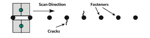 If two cracks in opposite sides of the fastener hole are present with the probe moving at right angles and centralized over the fastener the indications will typically add up to a larger indication. This is because both are being detected at the same time (with a fixed probe they would normally be detected one after the other in a 0° scan).