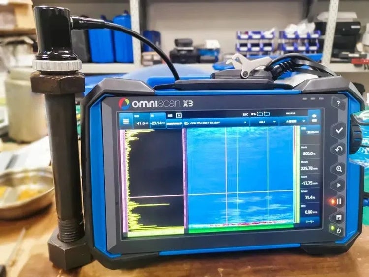 图1. OmniScan X3探伤仪与螺栓上的环阵探头相连