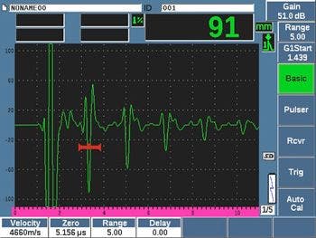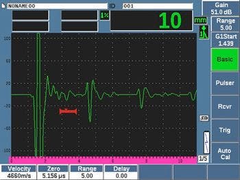 下面的示例显示了来自9.5 mm和12.5 mm铜管材之间的钎焊接头的几个典型回波,检测过程中使用了V208-RM延迟块探头和一台探伤仪。第一个波形代表来自外侧管材的无钎焊区域的参考回波,这个波形已经由一个闸门进行标记,并且被设为几乎满屏高。第二个波形代表来自合格钎焊接头的响应信号,这个回波在闸门区域中的信号波幅降到了非常低的水平。接下来是一个峰值较大的回波,代表来自内侧管材内表面的信号响应。在实际检测过程中,操作人员通过观察闸门内的回波波幅,并将每个回波波幅与上述相应回波的参考水平进行比较,可以确定每个检测点上的钎焊质量。