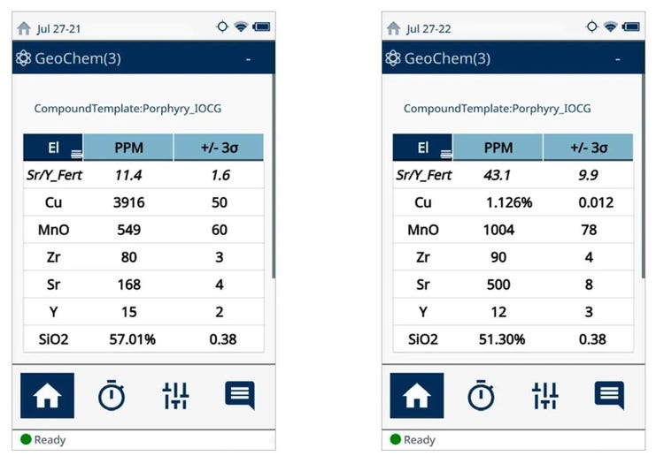 在实验室中测量的锶(Sr)、钇(Y)、氧化锰(MnO)、二氧化硅(SiO2)和锆(Zr)的不同比例组合可用于有效区分斑岩铜环境中的成矿特性和妨碍成矿的侵入体。最近,澳大利亚塔斯马尼亚大学矿床和地球科学中心(CODES)和英国莱斯特大学地理、地质和环境学院都对手持式分析仪在现场检测制备好和未制备样品以帮助勘探人员评估斑岩可开采性的能力进行了研究。