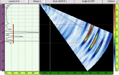 在室温下,使用45 dB增益在60度横波处探测到缺陷