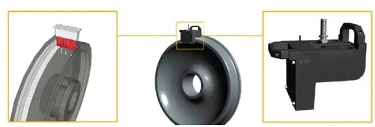 火车轮检测系统的相控阵探头在一分钟之内不仅可以从踏面和一个盘面检测轮缘,还可以从两侧检测轮毂。