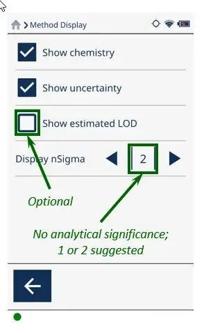 对于PMI测试,显示化学和不确定性以查看这些结果。显示估计的LOD(显示测试结果低于检测限的元素)是可选的。选中该选项有助于确定测试期间是否在特定阈值以上检测到特定元素。