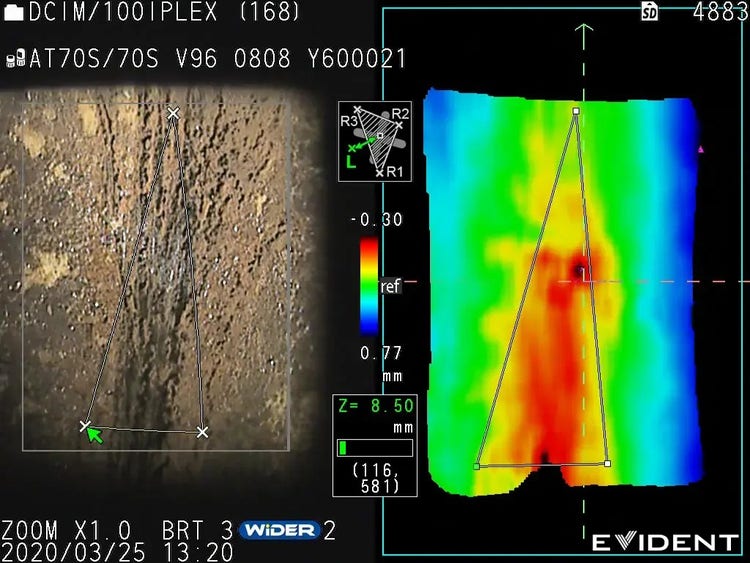 使用IPLEX系列视频内窥镜所提供的高级功能,检测人员可以测量管子内壁腐蚀区域的高度和深度。某些仪器(如IPLEX NX视频内窥镜)支持3D建模,可使检测人员更好地了解腐蚀的形状和大小。彩色映射3D图像无疑是另一个优势,特别是在报告制作方面,因为这些图像可以将管子的状况清楚地传达给资产所有者。捕获测量数据和创建3D模型既快速又高效,而且不需要耗时的校准。