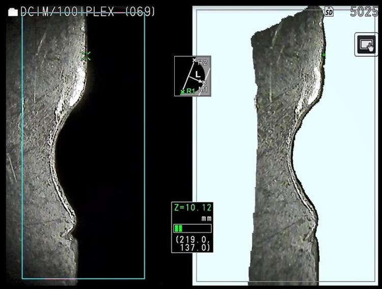 后者在焊缝检测应用中尤为有用,因为您可以更快地评估咬边等问题。对于不熟悉咬边的人而言,咬边即焊趾处熔入母材的凹槽。使用颜色编码的视觉效果,则可轻松找出这些凹槽。