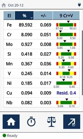 Metal and grade concentrations are shown after treatment where the desired alloy grade has been reached; analysis time 10 seconds