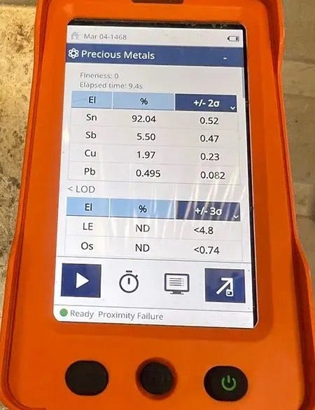 我的Vanta Element XRF分析仪由Evident制造,是XRF“枪式”分析仪的典范,可以提供准确的读数,从这根由高品位含锡废料制成的铸棒就可以看出这一点。图中所示的21.8公斤重铸棒是上周末在弗吉尼亚州铸造的118公斤铸棒的一部分。这种无损测量非常适合现场分析,常用于矿山、废料场和勘探现场。