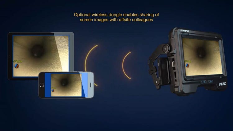 USB无线局域网(LAN)适配器可使您与远方的同事共享实时图像。使用视频内窥镜的无线连通性能,您可以利用常见的视频会议应用程序与检测专家进行交流,合作完成缺陷诊断。