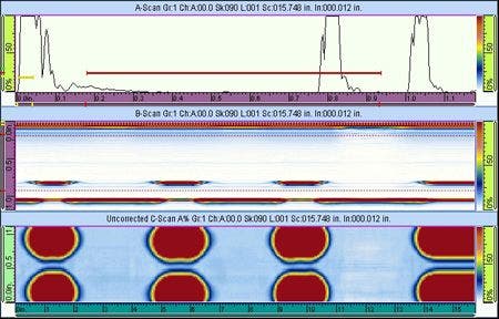 相控阵图像在实时显示体积数据方面的能力极为强大。在电子扫查中,成像过程成为真正的数据实时显示过程,而且可被用于手动和自动两种系统中,以提高缺陷的检出率。特别需要指出的是,功能更为强大的自动相控阵仪器不仅具有显示多个图像类型的功能,还可存储整个检测过程中得到的完整原始波形信息,从而可以在扫查完成后,对检测结果进行分析。因为所有超声波形数据都被收集、存储起来,因此在任何检测地点进行的扫查后分析,都可以使用相应的A扫描信息重建S扫描、C扫描和/或B扫描。例如,下面的屏幕同时显示了钢制试块中的一系列参考孔的检波A扫描波形、一个横截面B扫描图以及一个C扫描图像。