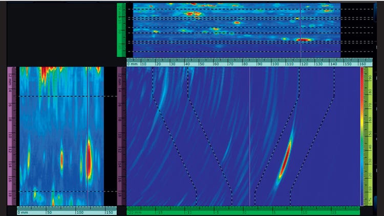 - The entire suspected area excluding the weld was then scanned using a 0-degree dual-linear probe