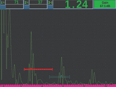 波形平均:这个功能可使实时A扫描代表采集到的A扫描平均值,平均除数为2、4、8、16、32。