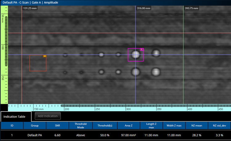 Create an indication table that is customized according to the parameters you need, such as flaw type, readings, threshold, and verdict. The indication table data is stored along with a snapshot image of each indication for your report.
