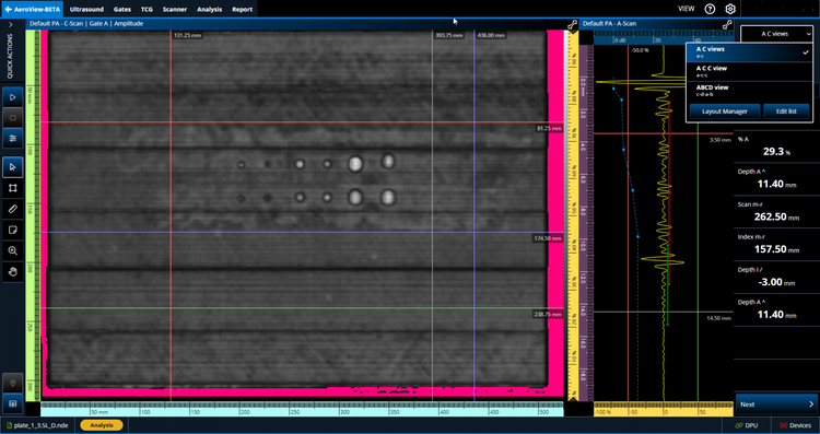 AeroView™ software enables you to acquire and analyze phased array and ultrasonic testing (PAUT) data of inspections performed at 0 degrees with an overlap. This software is specially designed to facilitate the analysis of aviation and aerospace inspection data, for both manufacturing and maintenance applications. It provides you with optimized layout and readings management and advanced analysis tools to ease interpretation of the acquired data and help ensure compliance with the specifications.