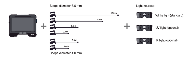 内窥镜直径有4 mm和6 mm两种,长度可达10 m。借助可互换的照明模块,您可以在白光LED、紫外线或红外线之间进行切换。